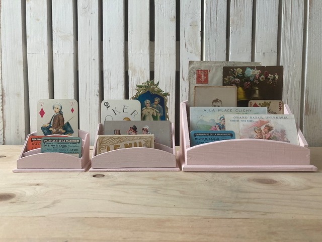 フランスのレターラックを1/2サイズで製作しました。 アンティークの実物のハーフサイズで作成しています。 ディスプレイやお店の什器としても活躍できます。 ショップカードや名刺を入れても素敵です。 今回新色2種類のご紹介です。 淡いピンクと淡いブルーグレーの2色です。 一緒に写っているカード類は付属しません。 パイン材で作っています。(中の仕切り板はベニヤ) 高さ 約10cm 横幅 約17.2cm 奥行 約9.6cm ※多少の誤差はご了承ください。 写真の見え方により実物と異なる色に見えることがあります。 1/3サイズや1/4サイズのレターラックもピンクやブルーグレーで製作可能ですので、ご入用の方はご連絡ください。
